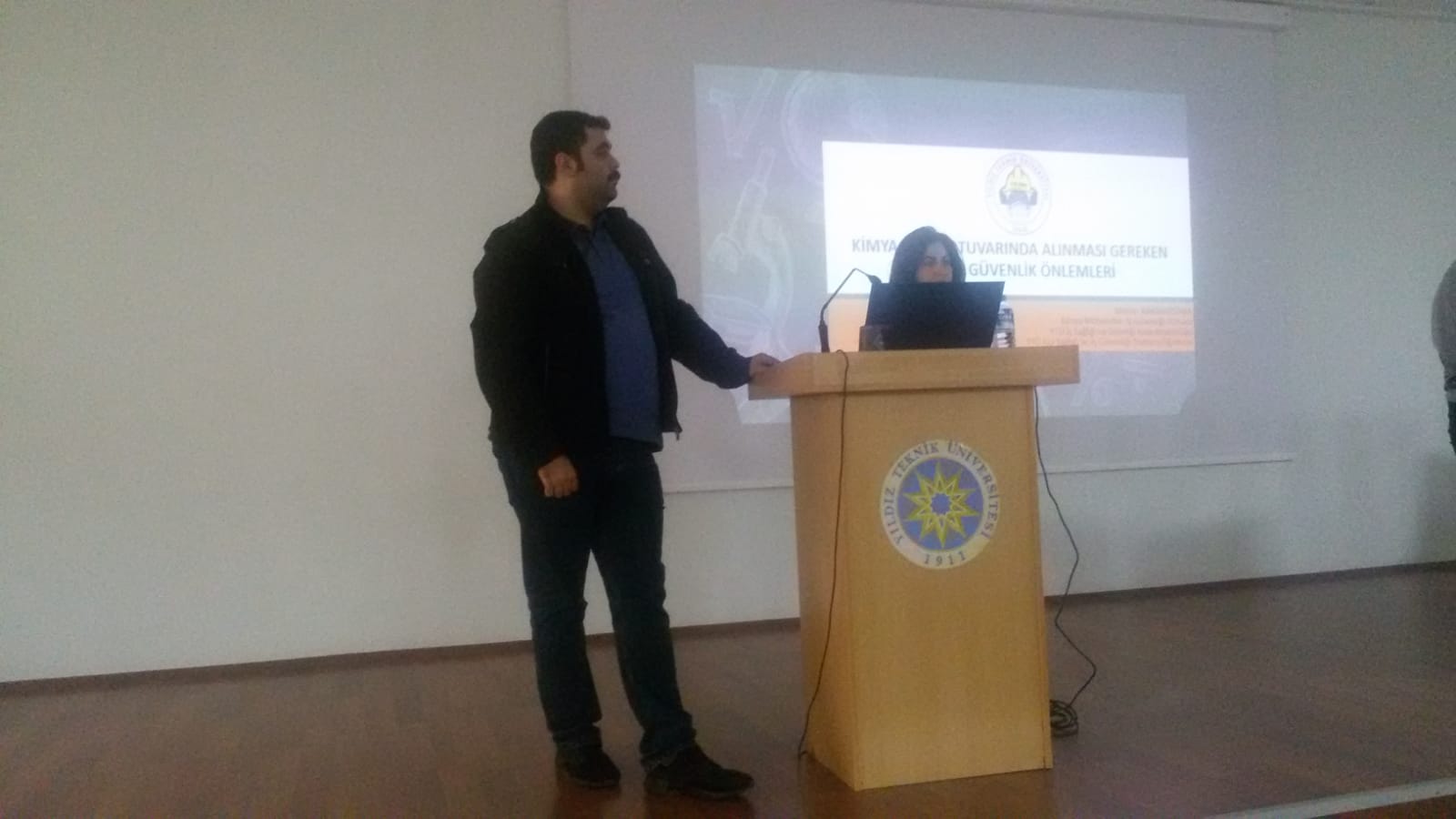 Yıldız Teknik Üniversitesi İş Sağlığı ve Güvenliği Koordinatörlüğünden İş Güvenliği Uzmanları Yüksek Mühendis Merve Karamustafa ve Danyel Yirmi'nin katılımları ile ''İş Sağlığı ve Güvenliği'' ve ''Occupational Health and Safety'' dersleri kapsamında ''Kimya Laboratuvarında Alınması Gereken Güvenlik Önlemleri'' konulu seminer düzenlenmiştir.