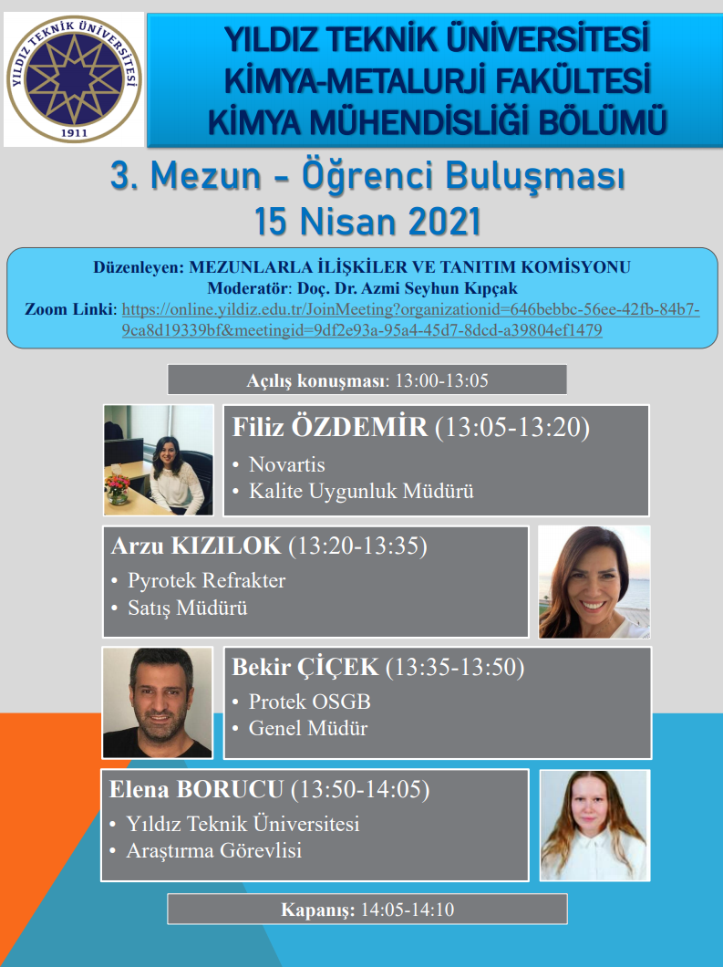 15 Nisan 2021 günü saat 13:00-14:10 arası bölümümüz "Mezunlar ile İlişkiler ve Tanıtım Komisyonu" tarafından çevrimiçi düzenlenmiş olan "3. Mezun - Öğrenci Buluşması" etkinliğimize ait bilgiler için tıklayınız.