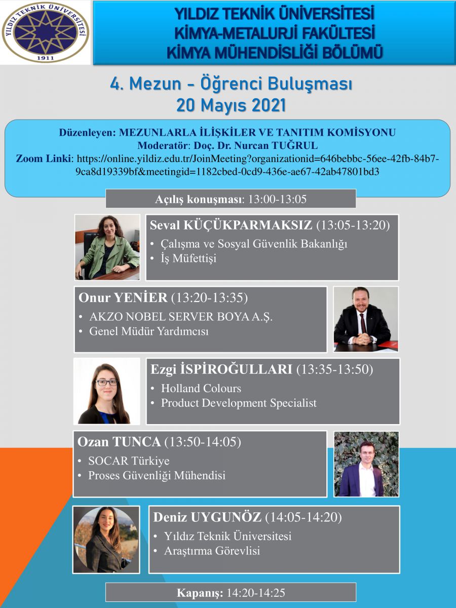 Değerli Öğrencilerimiz, 20 Nisan 2021 günü saat 13:00-14:20 arası bölümümüz "Mezunlar ile İlişkiler ve Tanıtım Komisyonu" tarafından çevrimiçi düzenlenecek olan "4. Mezun - Öğrenci Buluşması" etkinliğimiz kapsamında, farklı sektörlerde çalışan eski mezunlarımızdan Seval KÜÇÜKPARMAKSIZ, Onur YENİER, Ezgi İSPİROĞULLARI, Ozan TUNCA ve Arş.Gör. Deniz UYGUNÖZ, 3. ve 4. sınıflara bulundukları sektörü anlatan birer sunum yapacaklardır. Mail adreslerinize zoom linki gönderilmiştir aynı zamanda hem aşağıda hem de posterde yer almaktadır.