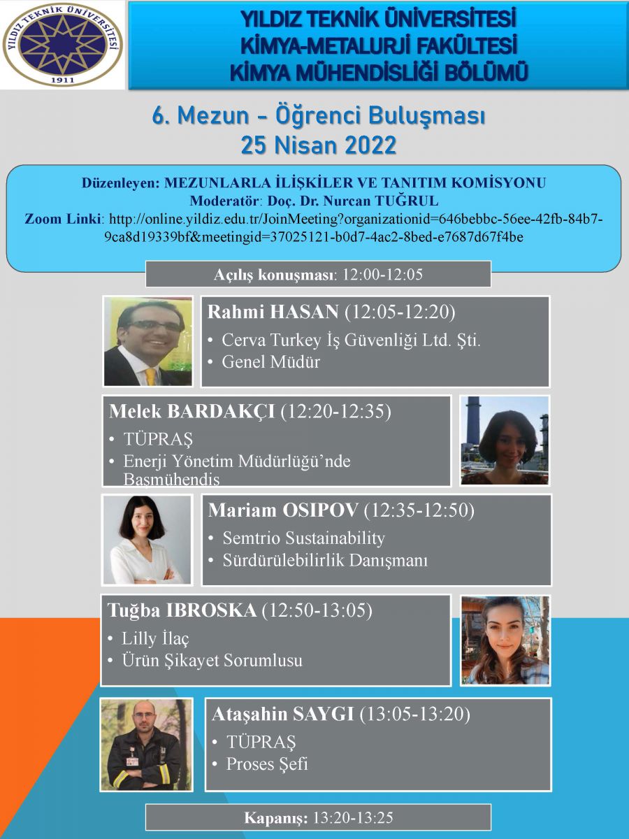 25 Nisan 2022 tarihinde bölümümüz "Mezunlar ile İlişkiler ve Tanıtım Komisyonu" tarafından çevrimiçi düzenlenecek olan "6. Mezun-Öğrenci buluşması" etkinliği farklı sektörlerde çalışan Rahmi HASAN, Melek BARDAKÇI TÜRKMEN, Mariam OSIPOV, Tuğba IBROSKA ve Ataşahin SAYGI'nın katılımları ile gerçekleştirilecektir.